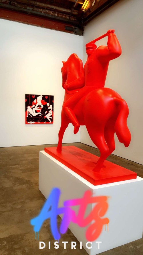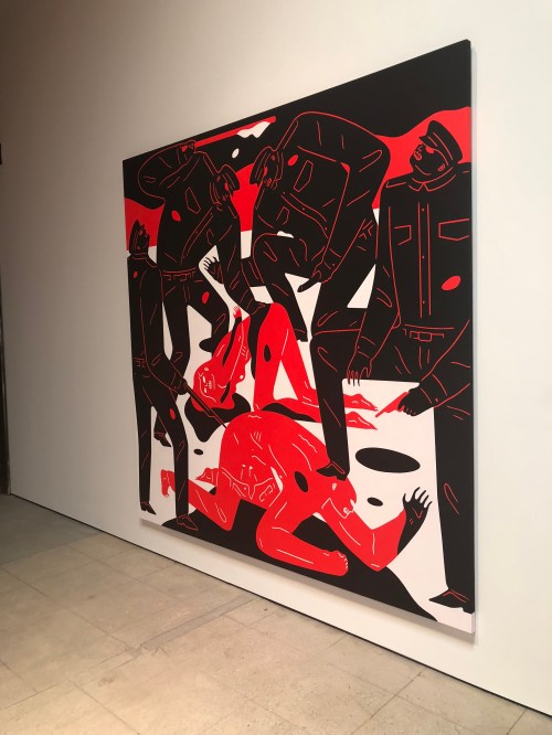 With a strong interest in human conflict throughout history, Cleon’s new body of work reconciled violent history in comparison with present-day violence. Usually depicted through flat, collage-like compositions in which characters of different colors are engaging in physical, blood-thirsty clash, the newest works are somewhat switching focus to what precedes or follows such events. The new nightmarish images are portraying everything from a gun-loving society, to explicit high society debauchery starring familiar figures such as Donald Trump himself. Along with those, the new black, red and white paintings are bringing up some of the topics of modern US society, such as politics, police brutality or confederate monuments issue.