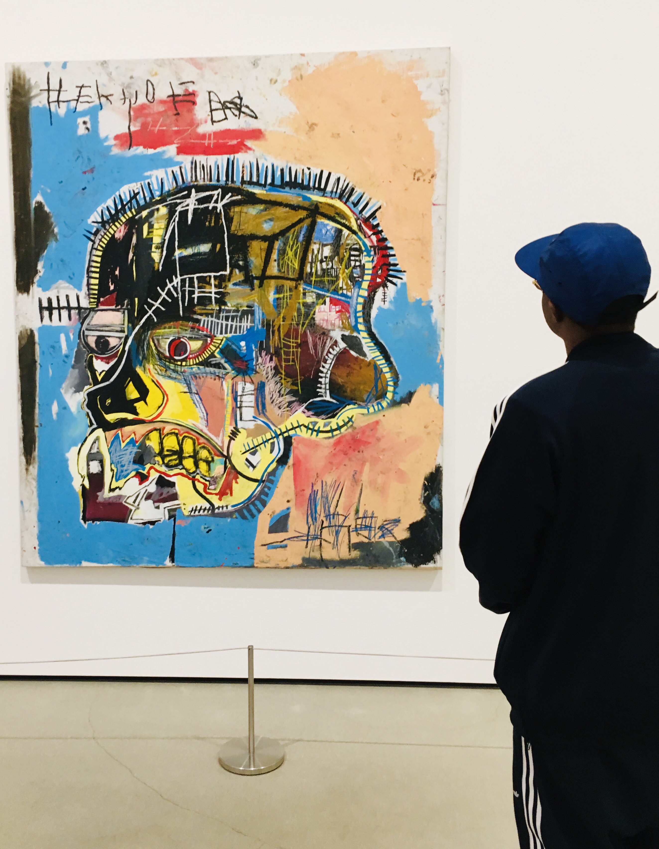 Many of Jean-Michel Basquiat’s paintings are in some way autobiographical, and Untitled may be considered a form of self-portraiture. The skull here exists somewhere between life and death. The eyes are listless, the face is sunken in, and the head looks lobotomized and subdued. Yet there are wild colors and spirited marks that suggest a surfeit of internal activity. Developing his own personal iconography, in this early work Basquiat both alludes to modernist appropriation of African masks and employs the mask as a means of exploring identity. Basquiat labored over this painting for months — evident in the worked surface and imagery — while most of his pieces were completed with bursts of energy over just a few days. The intensity of the painting, which was presented at his debut solo gallery exhibition in New York City, may also represent Basquiat’s anxieties surrounding the pressures of becoming a commercially successful artist.